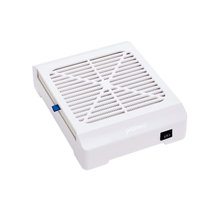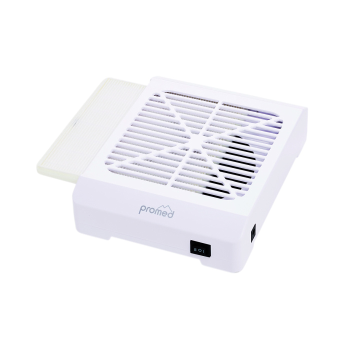 De Promed Nailfan Mini is een tafel afzuigingssysteem die u helpt tijdens het vijlen. Vijl stof wordt veroorzaakt door vormen, vijlen en polijsten van natuurlijke nagels en kunstnagels. Dit afzuigingssysteem zuigt stof, fijnstof, stofdeeltjes en vijlresten op, wanneer u bezig bent met het vijlen van kunstnagels. Deze Promed afzuiging voor op tafel heeft een ergonomische ontwerp ideaal voor een klantvriendelijk steunvlak om de handen van uw klanten te kunnen laten rusten. Tevens ook comfort voor u, een goede werkhouding! De tafelafzuiging van Promed werkt eenvoudig en het vermogen is in te stellen in twee verschillende low noise zuigniveau's. Het afzuigsysteem is gemakkelijk aan te sluiten met een stekker en is direct klaar voor gebruik. De Promed Nailfan Mini is een compacte en ergonomische tafelafzuiging die ideaal is voor een nageltafel waar u niet al teveel ruimte heeft. Het opvanggebied is zeer groot, het gehele oppervlak zuigt stof op, geen stof kan meer ontsnappen aan de Promed Nailfan Mini. In de Promed Nailfan Mini zit een fijnstof filter, tevens eenvoudig te vervangen, schoon te maken en heeft geen filterzak nodig, koopt u deze stofafzuiging dan zitten er twee filters in de doos!