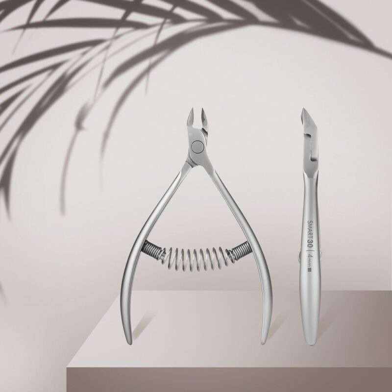 Professionele nagelriemtang met een lemmetlengte van 4 mm en rechte snijvlakken met een lichte helling. De snijzone is voorzien van een praktische uitstulping (“hiel”) voor nauwkeurige en gecontroleerde verwijdering van de nagelriem. De korte, afgeronde handgrepen liggen comfortabel in de hand en zorgen voor moeiteloos gebruik. De satijnen afwerking voelt aangenaam aan, terwijl het matte oppervlak van de handgrepen lichtreflectie voorkomt en de ogen van de specialist niet belast.